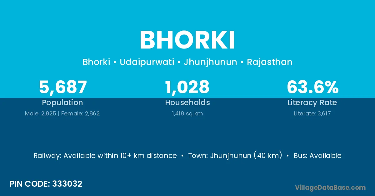 Jhunjhunun (40 km) is the nearest town to Bhorki village for major economic activities and is located approximately 40 km away.
