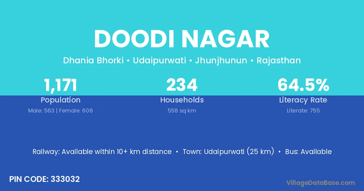 Udaipurwati (25 km) is the nearest town to Doodi Nagar village for major economic activities and is located approximately 25 km away.