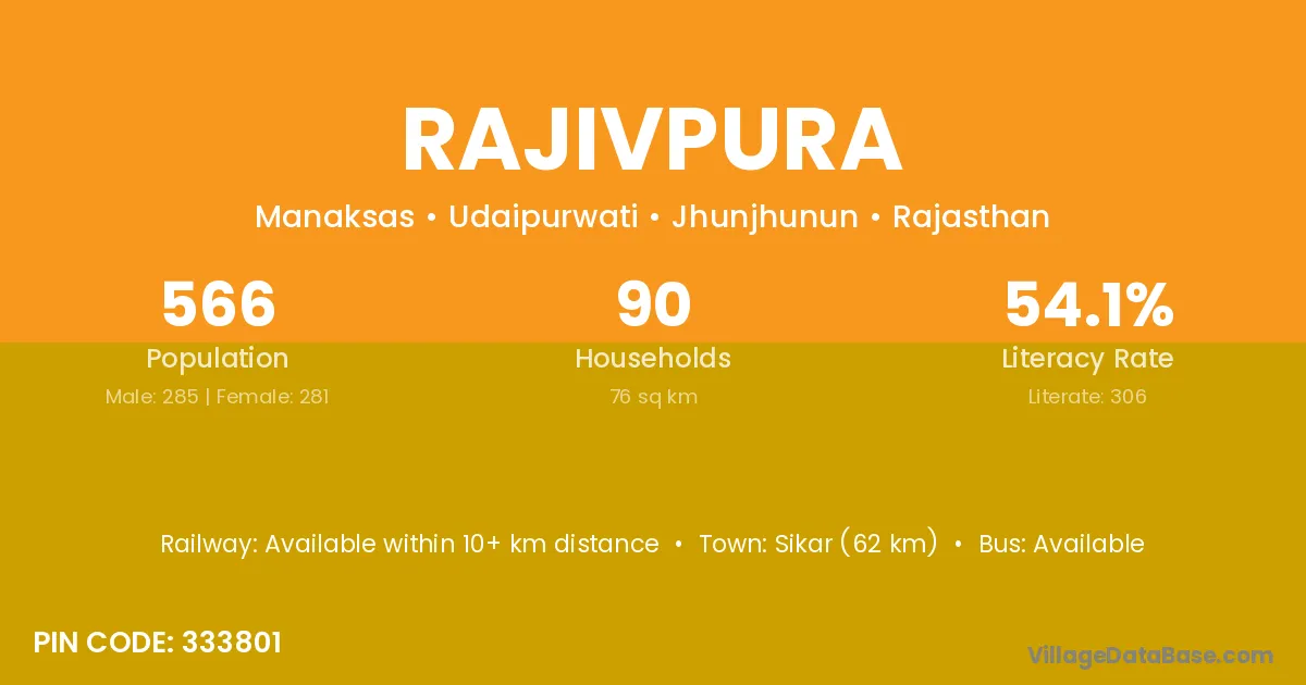 Sikar (62 km) is the nearest town to Rajivpura village for major economic activities and is located approximately 62 km away.