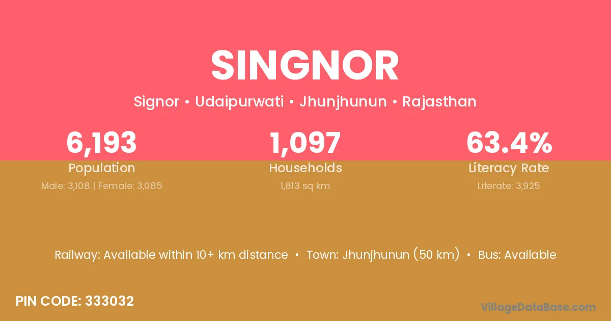 Jhunjhunun (50 km) is the nearest town to Singnor village for major economic activities and is located approximately 50 km away.