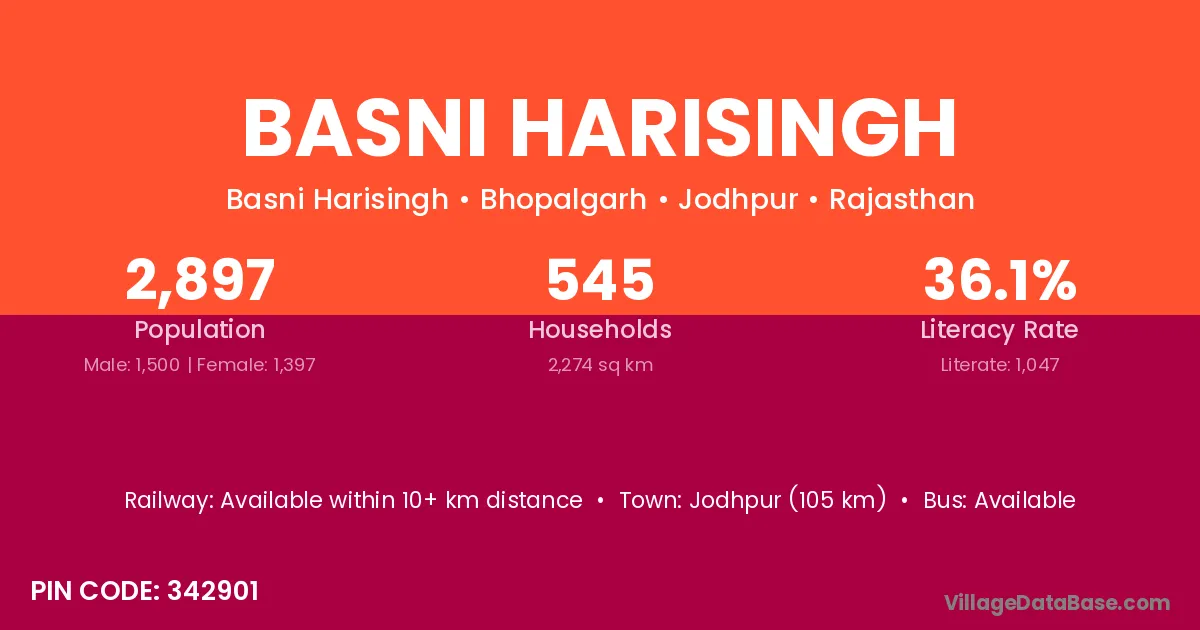 Jodhpur (105 km) is the nearest town to Basni Harisingh village for major economic activities and is located approximately 105 km away.