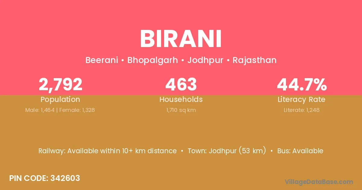 Jodhpur (53 km) is the nearest town to Birani village for major economic activities and is located approximately 53 km away.