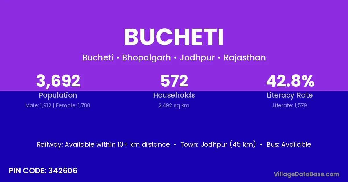 Jodhpur (45 km) is the nearest town to Bucheti village for major economic activities and is located approximately 45 km away.
