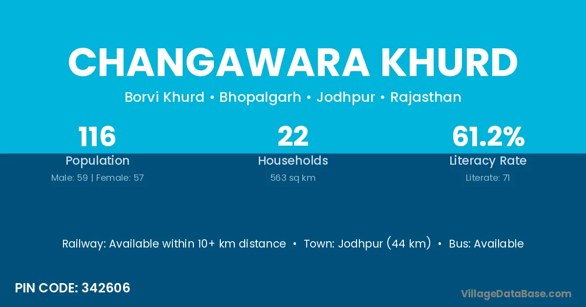 Jodhpur (44 km) is the nearest town to Changawara Khurd village for major economic activities and is located approximately 44 km away.