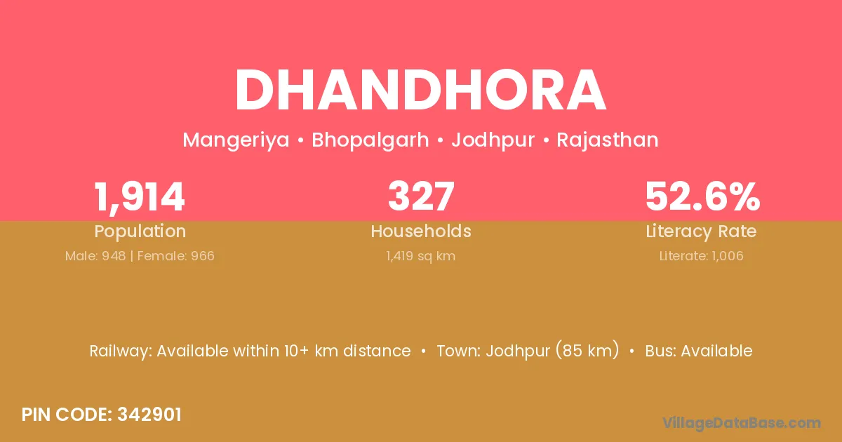 Jodhpur (85 km) is the nearest town to Dhandhora village for major economic activities and is located approximately 85 km away.