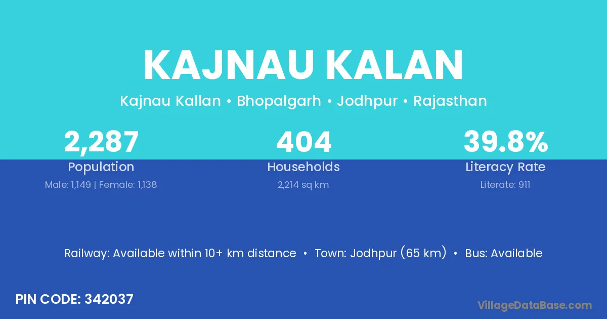 Jodhpur (65 km) is the nearest town to Kajnau Kalan village for major economic activities and is located approximately 65 km away.