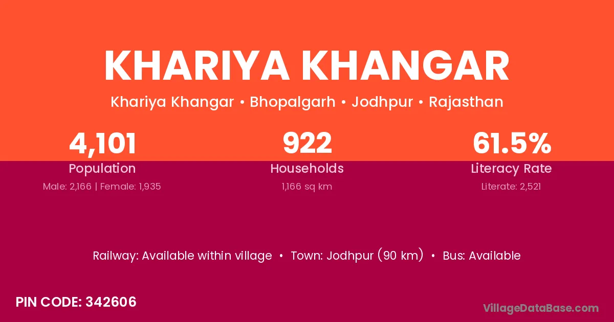 Jodhpur (90 km) is the nearest town to Khariya Khangar village for major economic activities and is located approximately 90 km away.