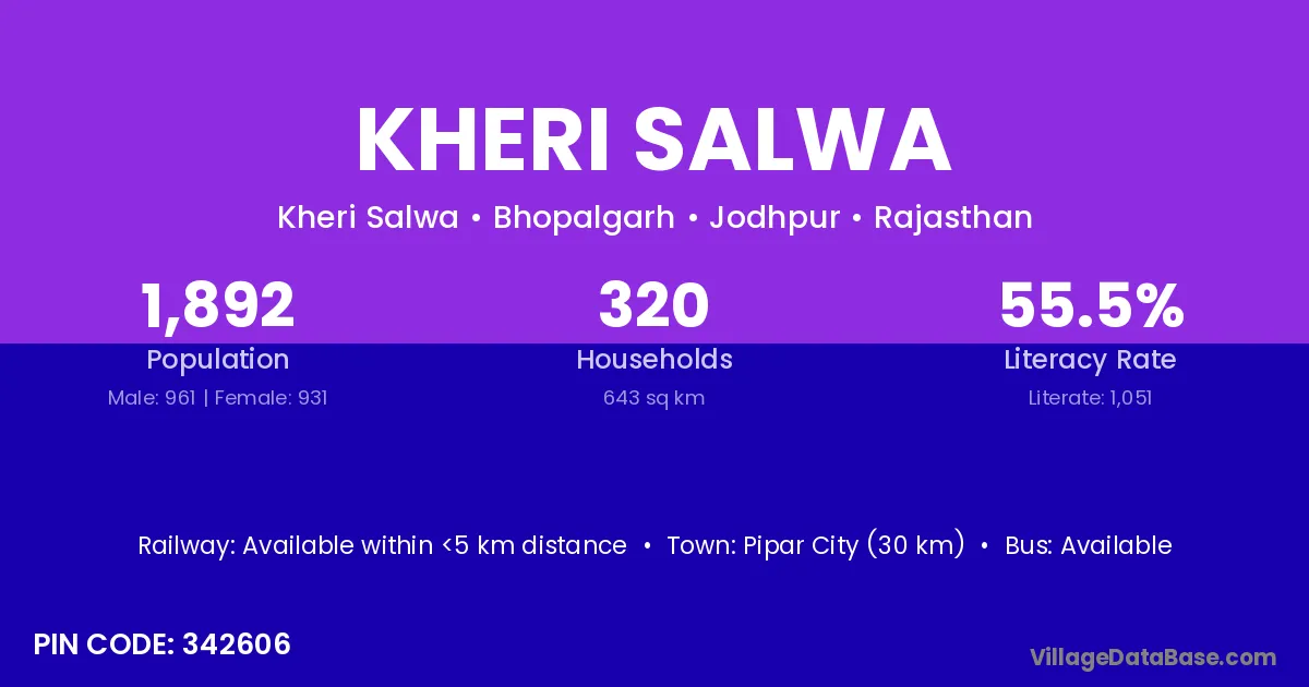 Pipar City (30 km) is the nearest town to Kheri Salwa village for major economic activities and is located approximately 30 km away.
