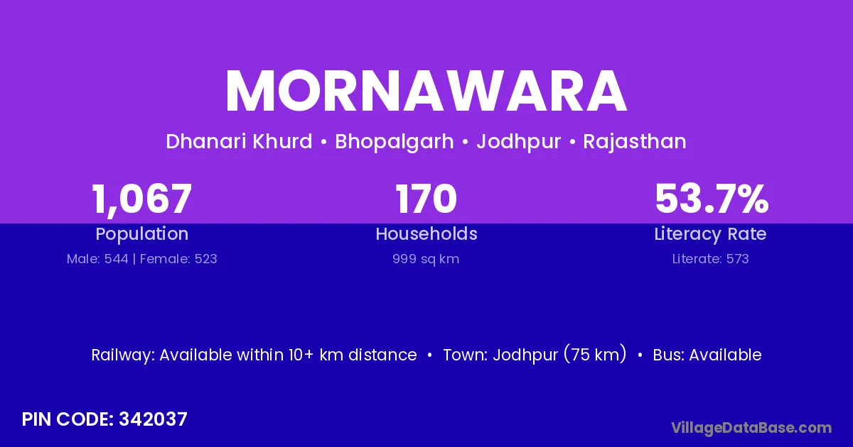 Jodhpur (75 km) is the nearest town to Mornawara village for major economic activities and is located approximately 75 km away.