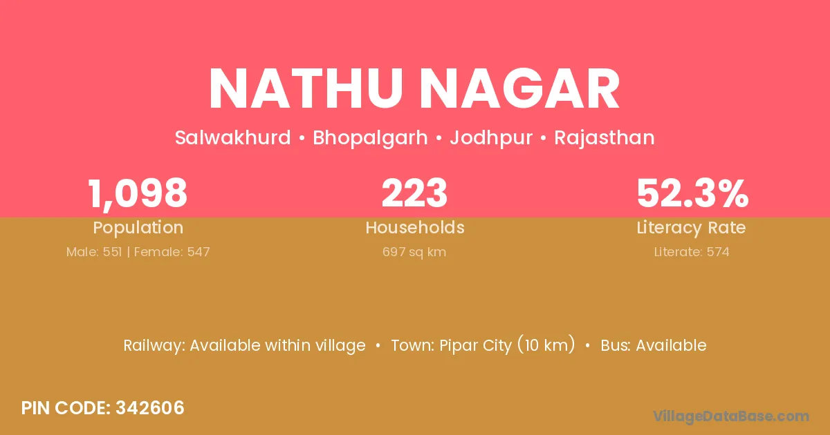 Pipar City (10 km) is the nearest town to Nathu Nagar village for major economic activities and is located approximately 10 km away.