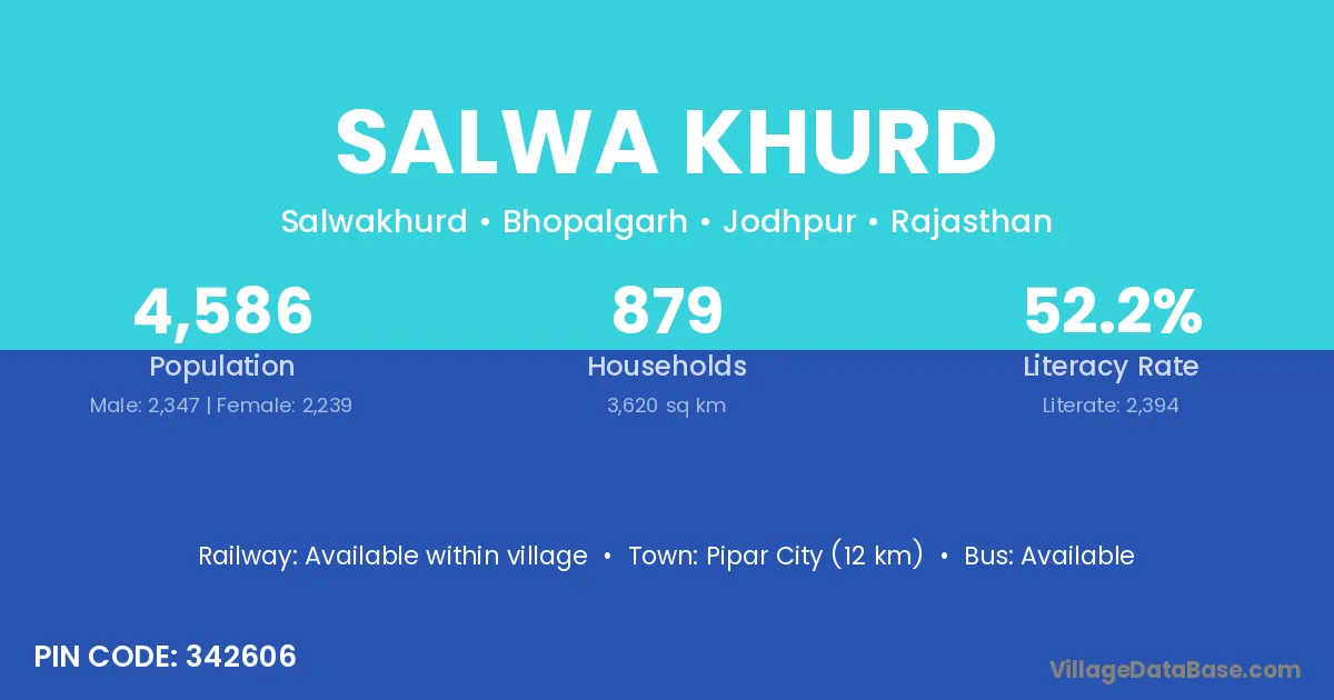 Pipar City (12 km) is the nearest town to Salwa Khurd village for major economic activities and is located approximately 12 km away.