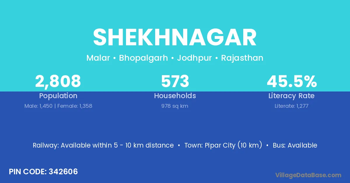 Pipar City (10 km) is the nearest town to Shekhnagar village for major economic activities and is located approximately 10 km away.