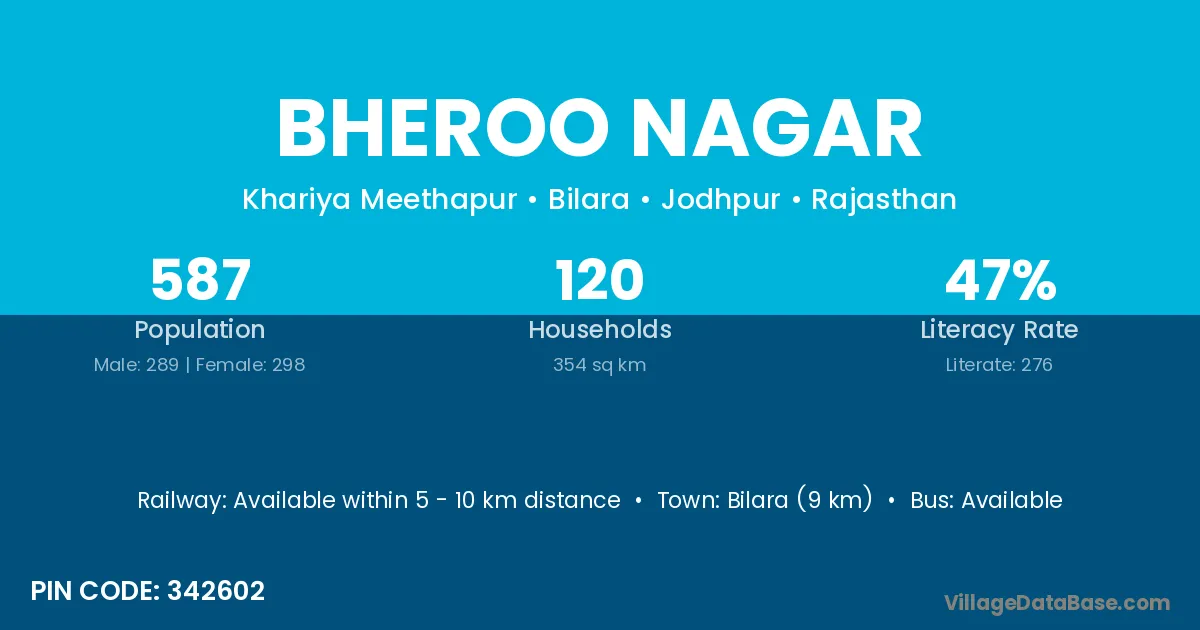 Bilara (9 km) is the nearest town to Bheroo Nagar village for major economic activities and is located approximately 9 km away.