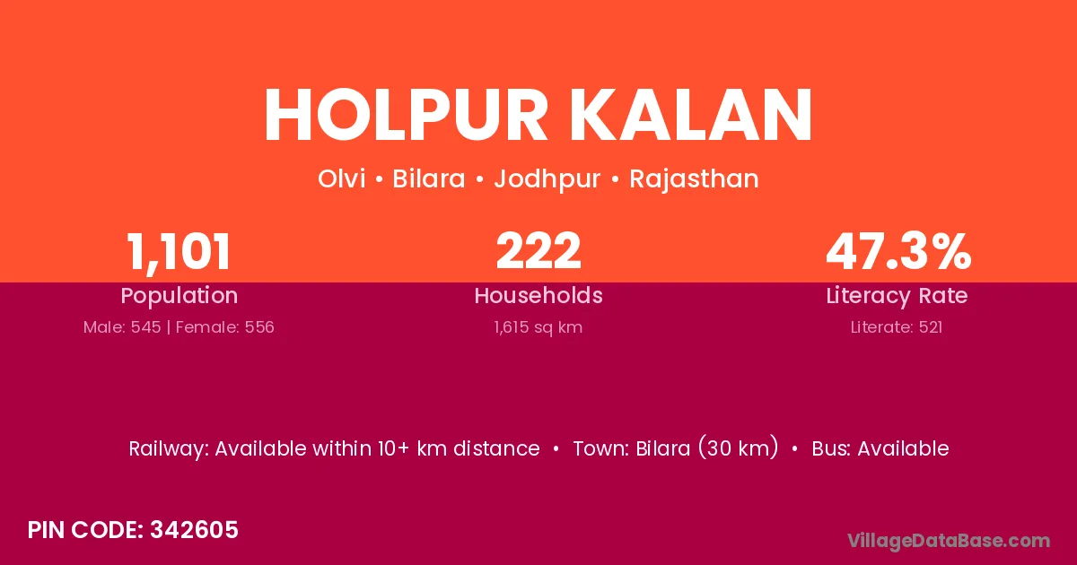 Bilara (30 km) is the nearest town to Holpur Kalan village for major economic activities and is located approximately 30 km away.