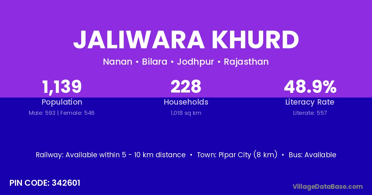 Pipar City (8 km) is the nearest town to Jaliwara Khurd village for major economic activities and is located approximately 8 km away.