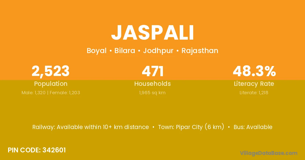 Pipar City (6 km) is the nearest town to Jaspali village for major economic activities and is located approximately 6 km away.