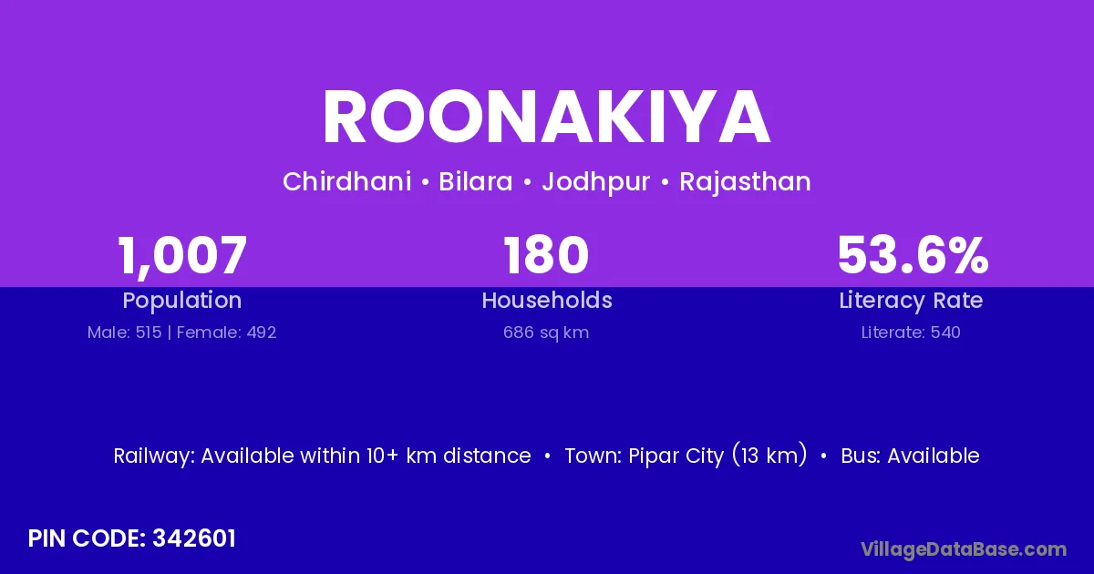 Pipar City (13 km) is the nearest town to Roonakiya village for major economic activities and is located approximately 13 km away.
