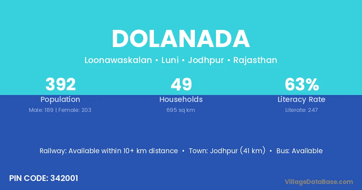 Jodhpur (41 km) is the nearest town to Dolanada village for major economic activities and is located approximately 41 km away.