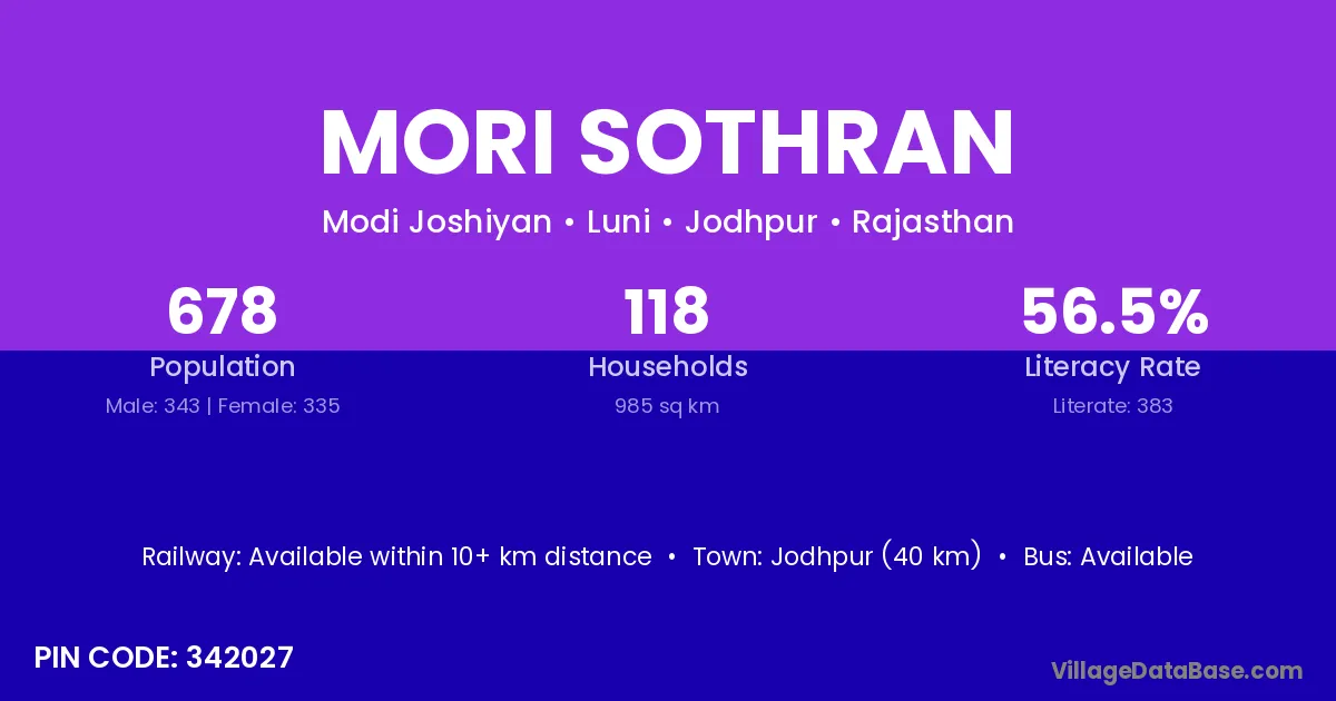Jodhpur (40 km) is the nearest town to Mori Sothran village for major economic activities and is located approximately 40 km away.