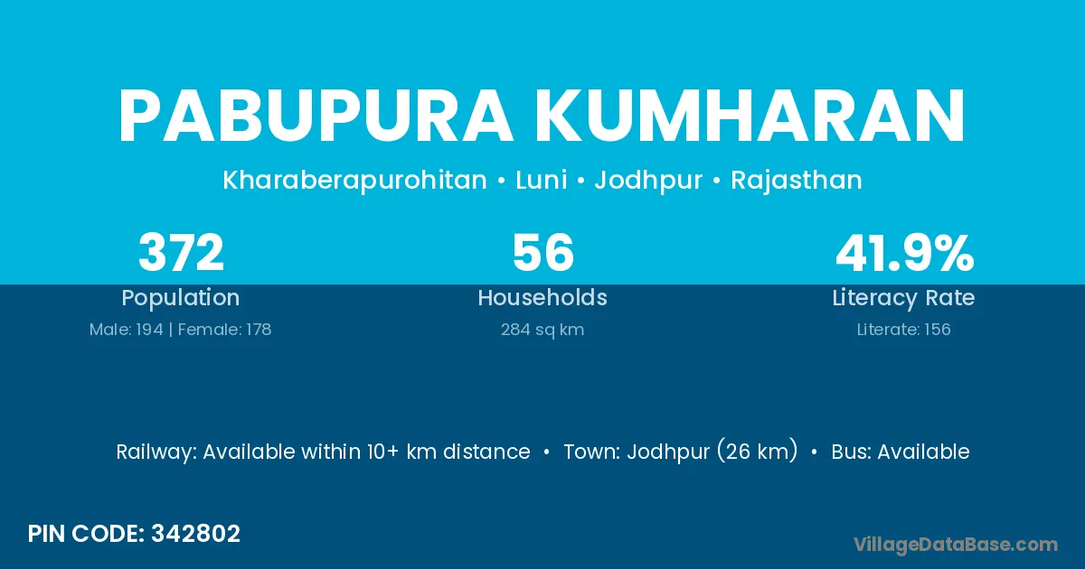 Jodhpur (26 km) is the nearest town to Pabupura Kumharan village for major economic activities and is located approximately 26 km away.