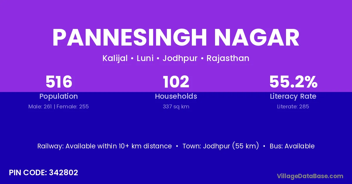 Jodhpur (55 km) is the nearest town to Pannesingh Nagar village for major economic activities and is located approximately 55 km away.