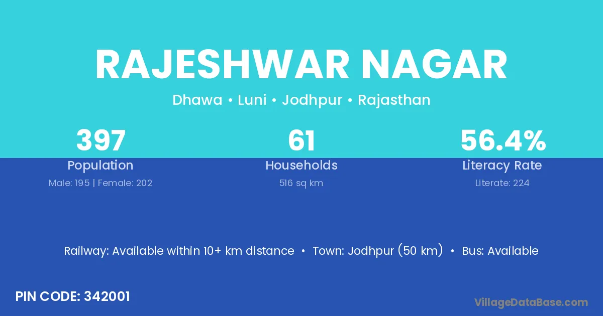 Jodhpur (50 km) is the nearest town to Rajeshwar Nagar village for major economic activities and is located approximately 50 km away.