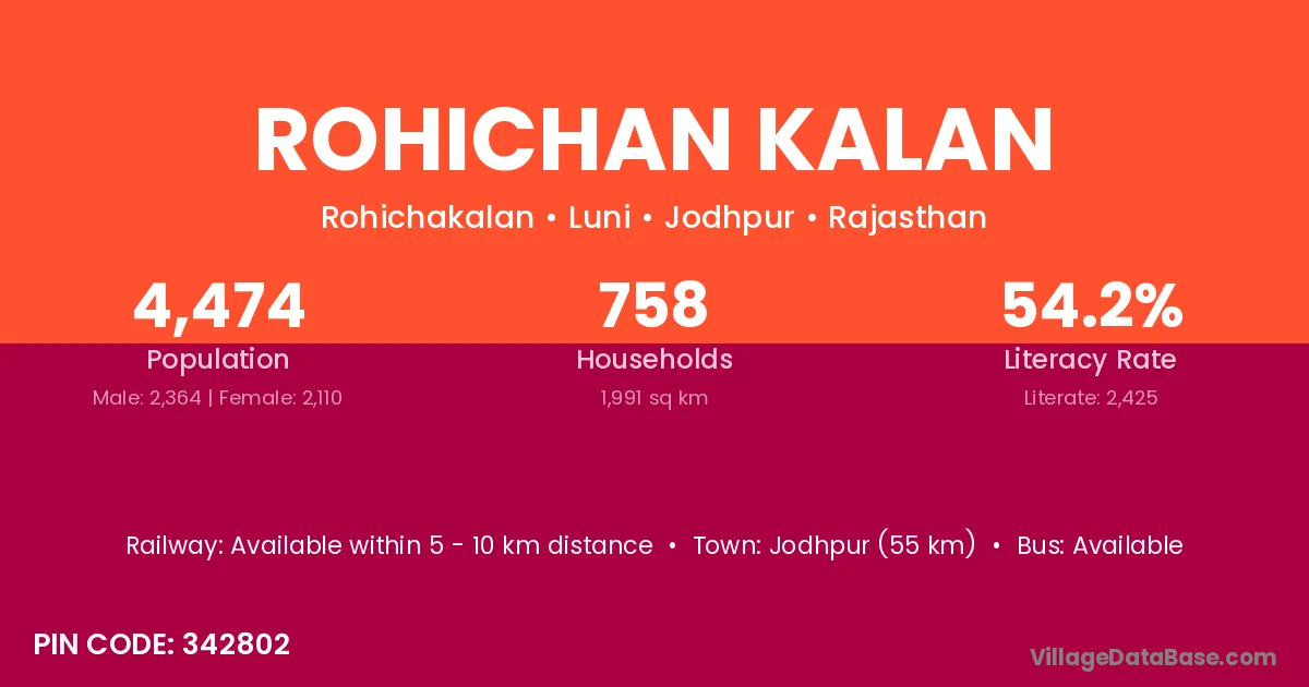 Jodhpur (55 km) is the nearest town to Rohichan Kalan village for major economic activities and is located approximately 55 km away.