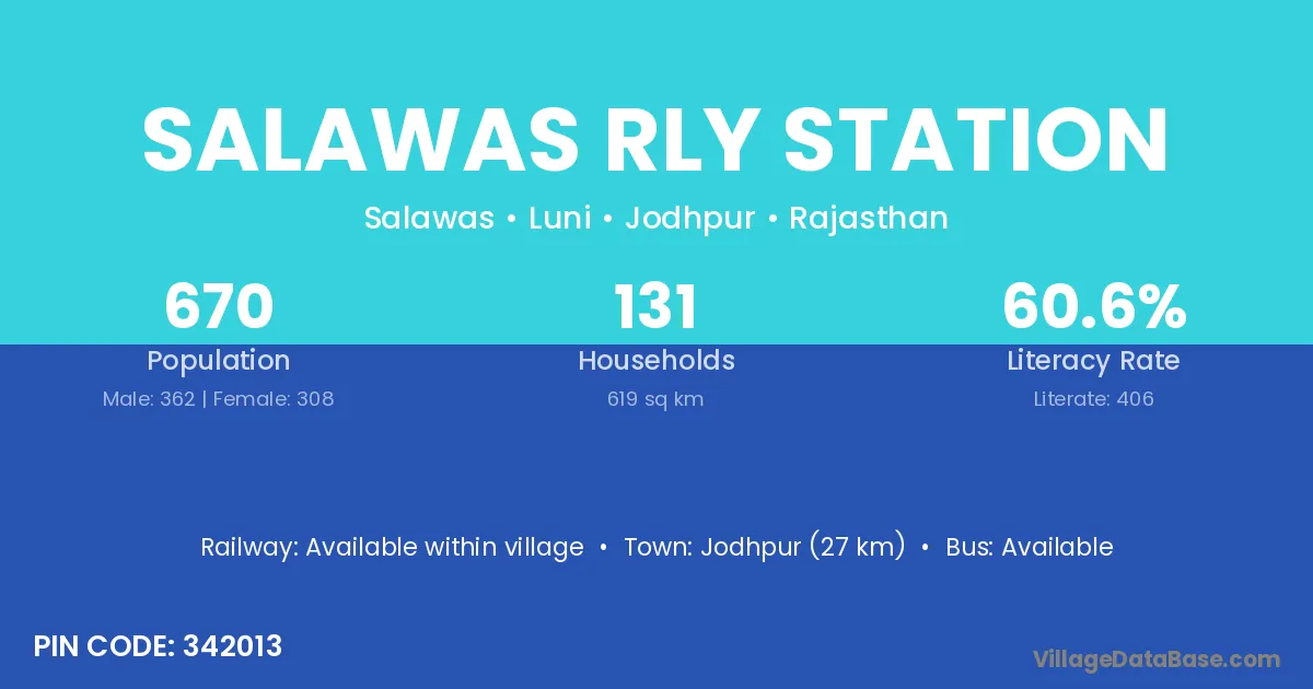 Salawas Rly Station village has a total population of 670 people, of which 362 are males and 308 are females.