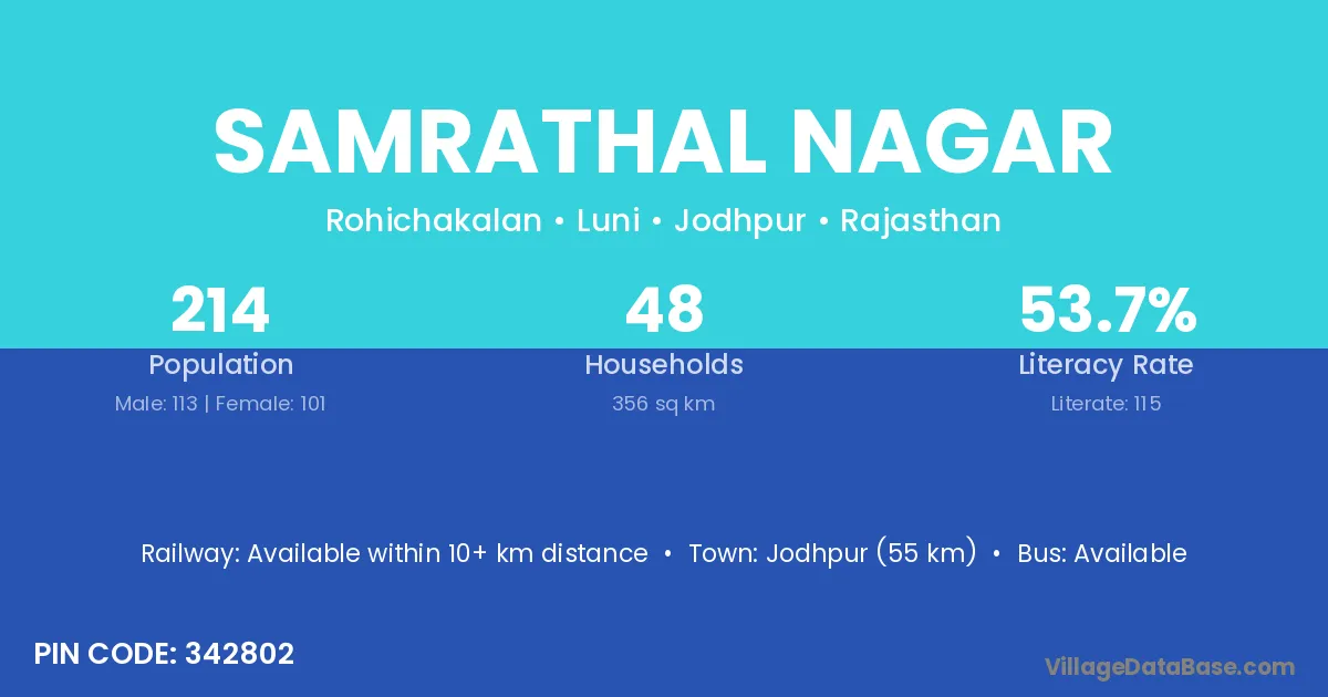 Jodhpur (55 km) is the nearest town to Samrathal Nagar village for major economic activities and is located approximately 55 km away.