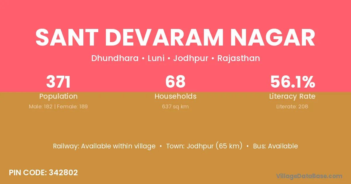 Jodhpur (65 km) is the nearest town to Sant Devaram Nagar village for major economic activities and is located approximately 65 km away.