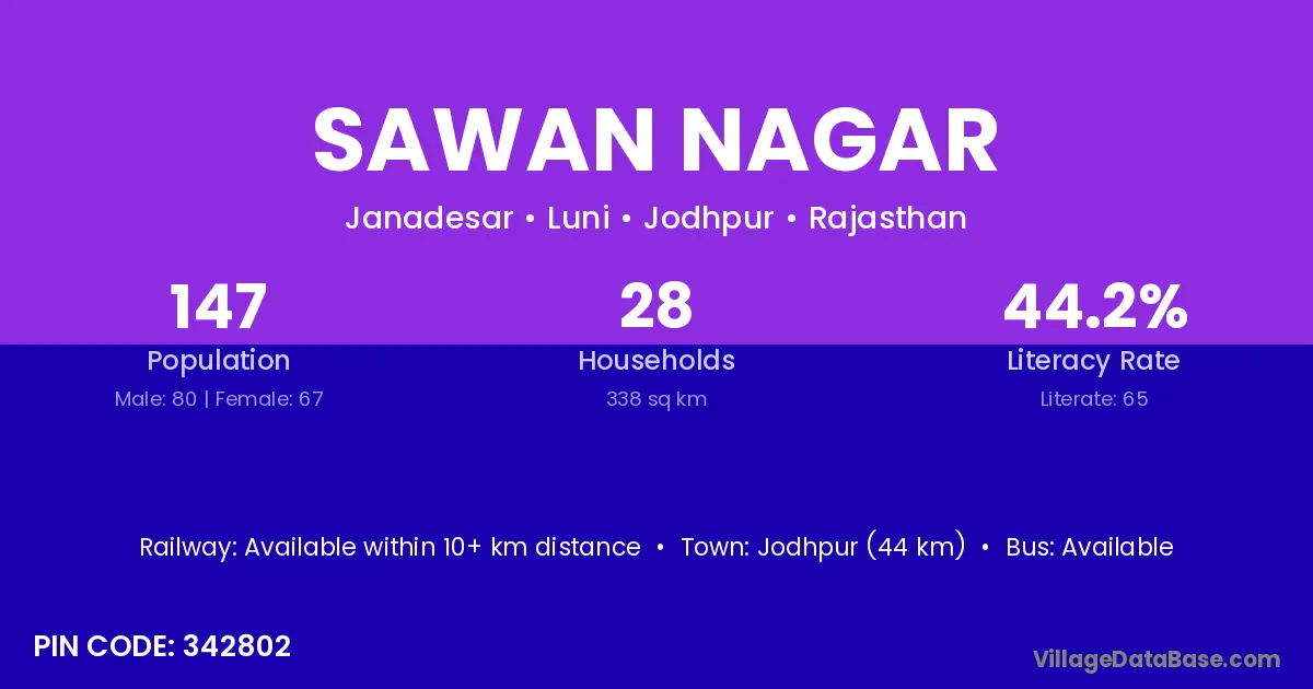 Jodhpur (44 km) is the nearest town to Sawan Nagar village for major economic activities and is located approximately 44 km away.