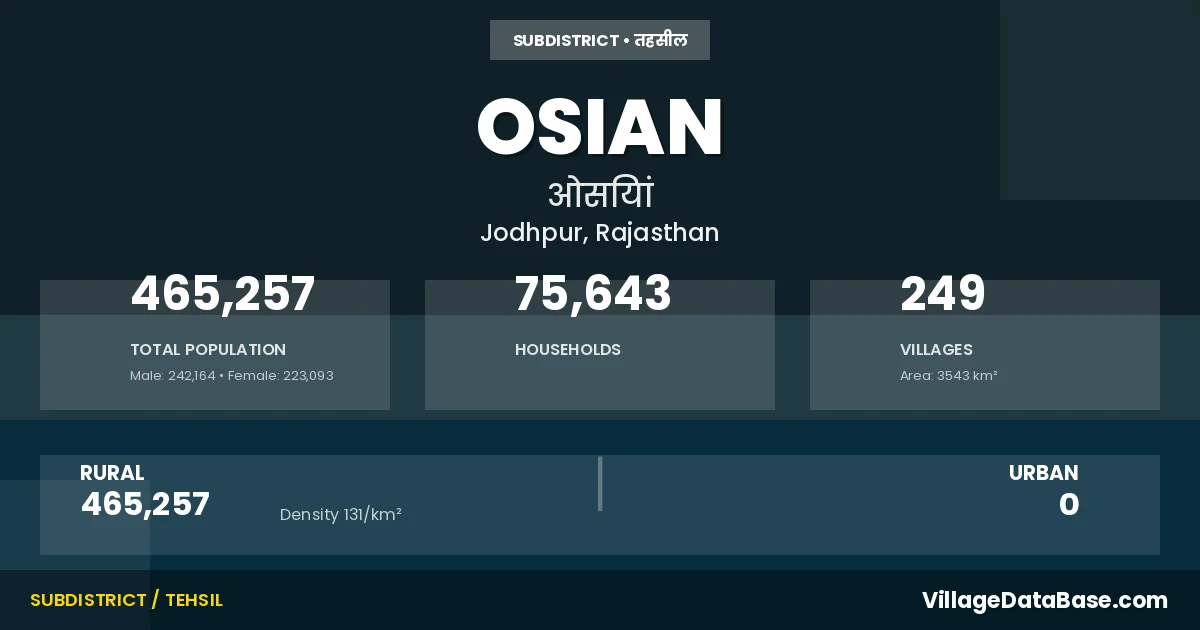 According to the 2011 census The total area of Osian Tehsil is 3543 km², with a population of 465257 people. The population density is 131 inhabitants per square kilometre, and there are approximately 75643 houses in the sub district.