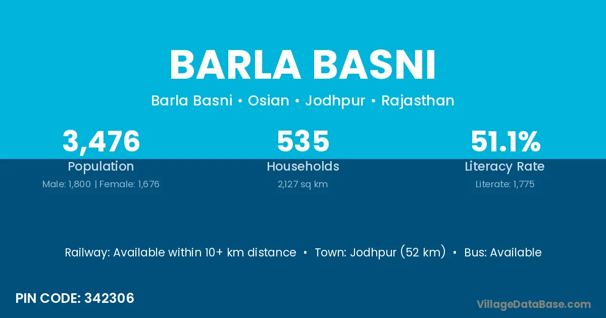 Jodhpur (52 km) is the nearest town to Barla Basni village for major economic activities and is located approximately 52 km away.