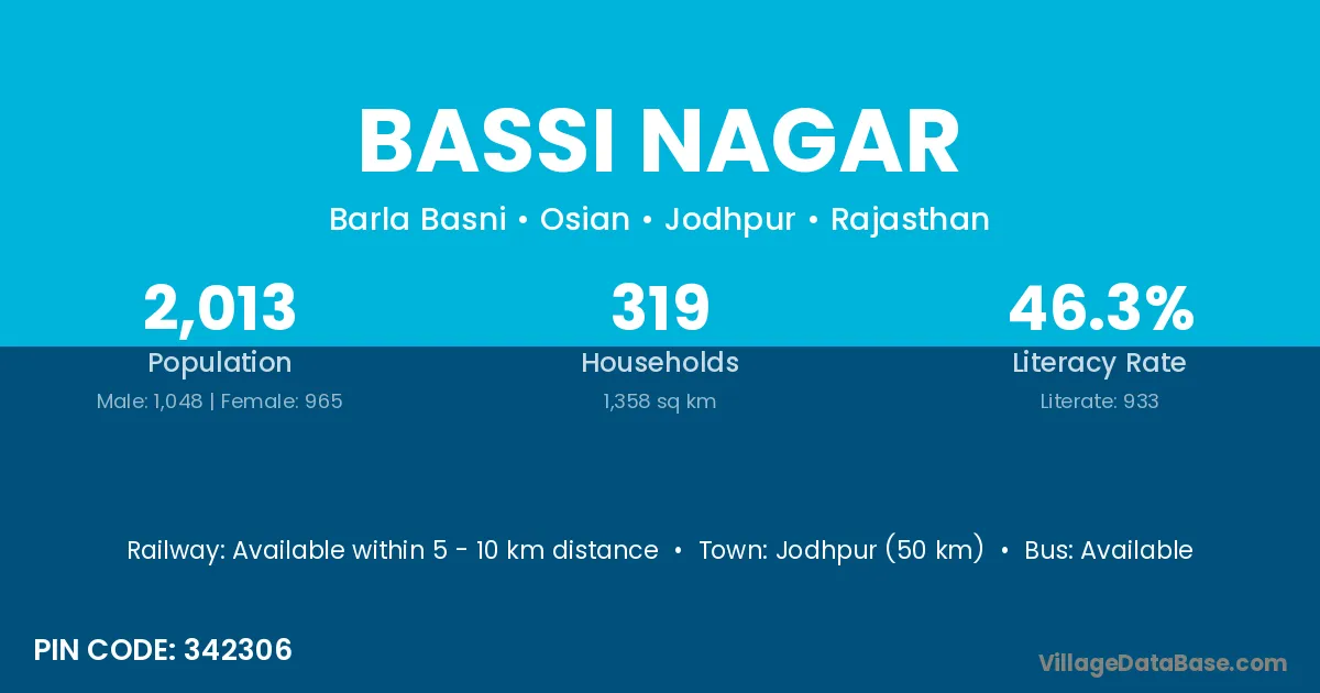 Jodhpur (50 km) is the nearest town to Bassi Nagar village for major economic activities and is located approximately 50 km away.
