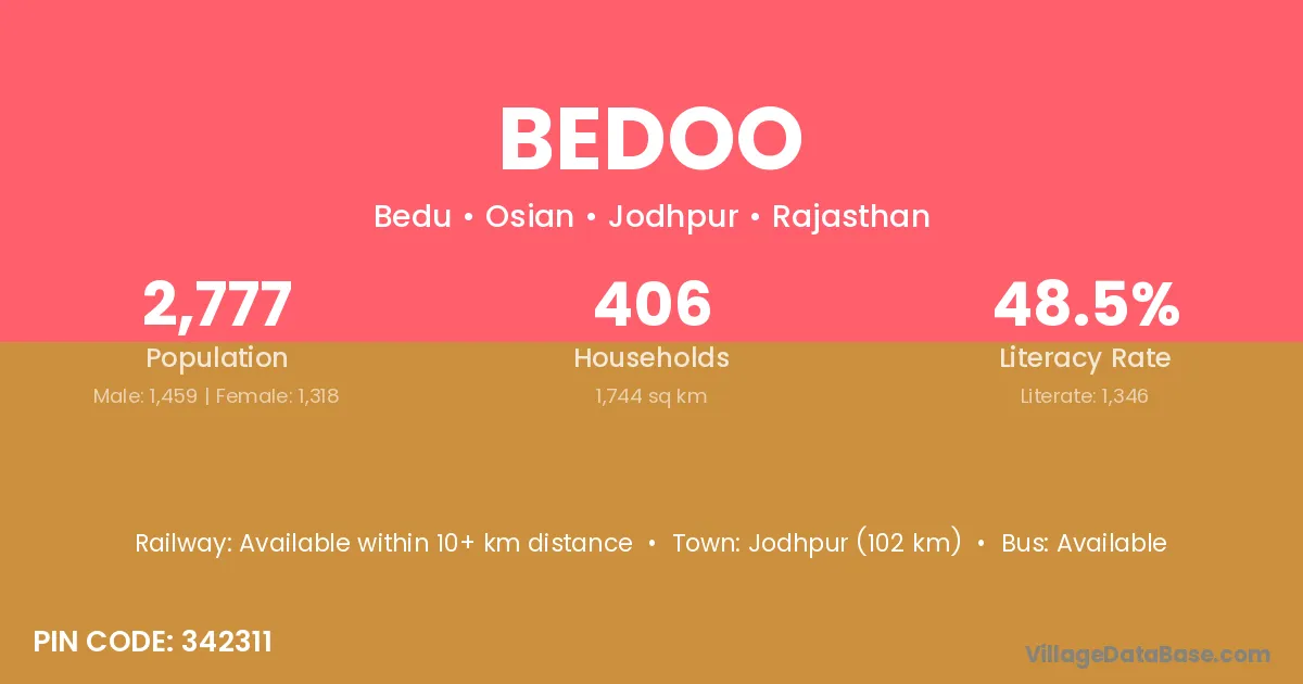 Jodhpur (102 km) is the nearest town to Bedoo village for major economic activities and is located approximately 102 km away.