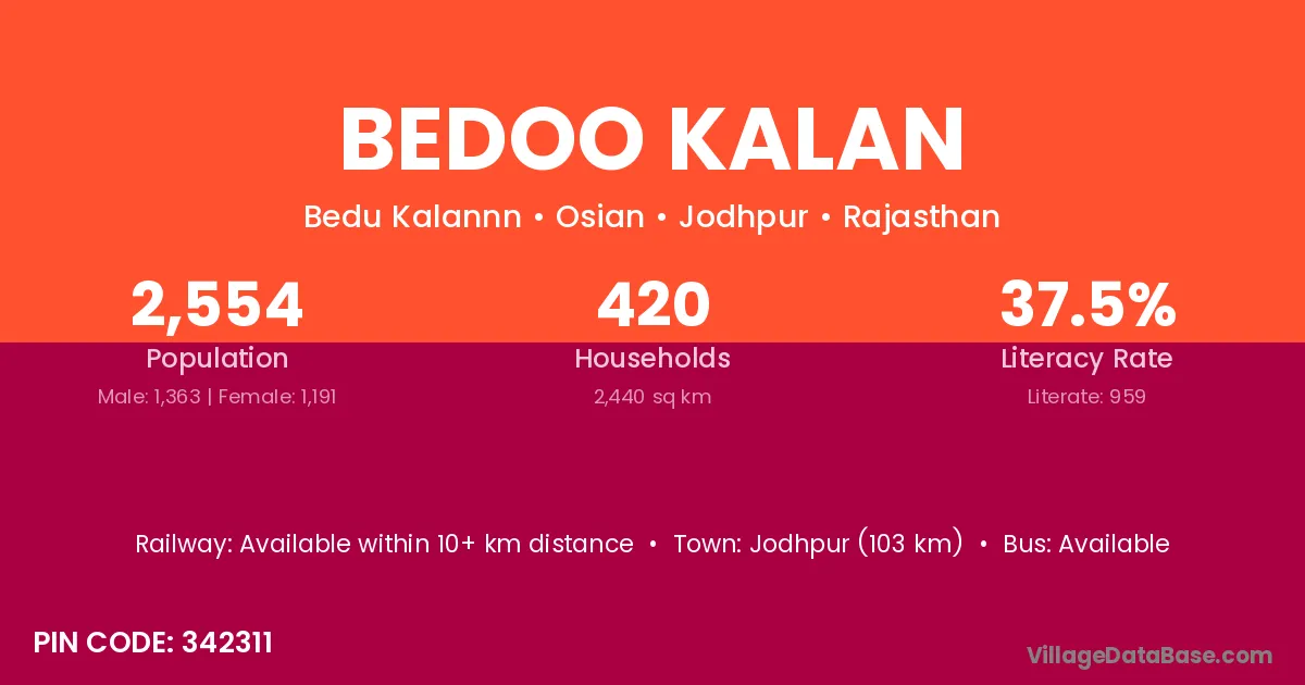 Jodhpur (103 km) is the nearest town to Bedoo Kalan village for major economic activities and is located approximately 103 km away.