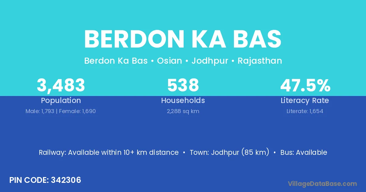 Jodhpur (85 km) is the nearest town to Berdon Ka Bas village for major economic activities and is located approximately 85 km away.