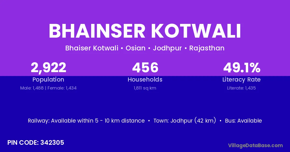 Jodhpur (42 km) is the nearest town to Bhainser Kotwali village for major economic activities and is located approximately 42 km away.