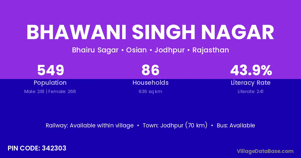 Jodhpur (70 km) is the nearest town to Bhawani Singh Nagar village for major economic activities and is located approximately 70 km away.