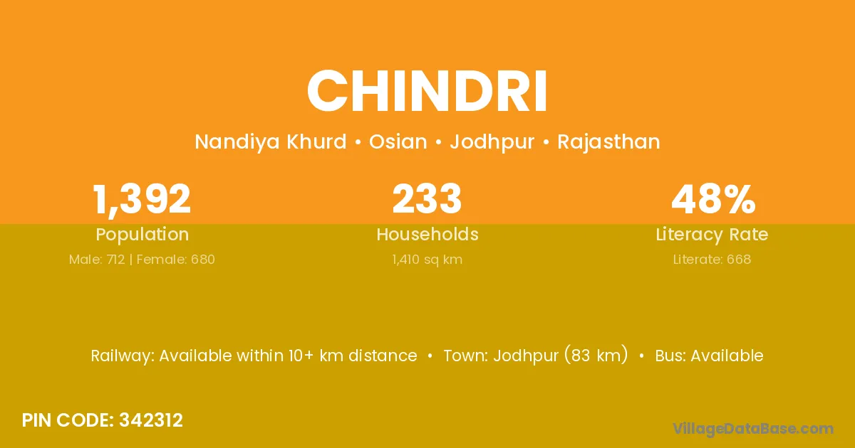 Jodhpur (83 km) is the nearest town to Chindri village for major economic activities and is located approximately 83 km away.