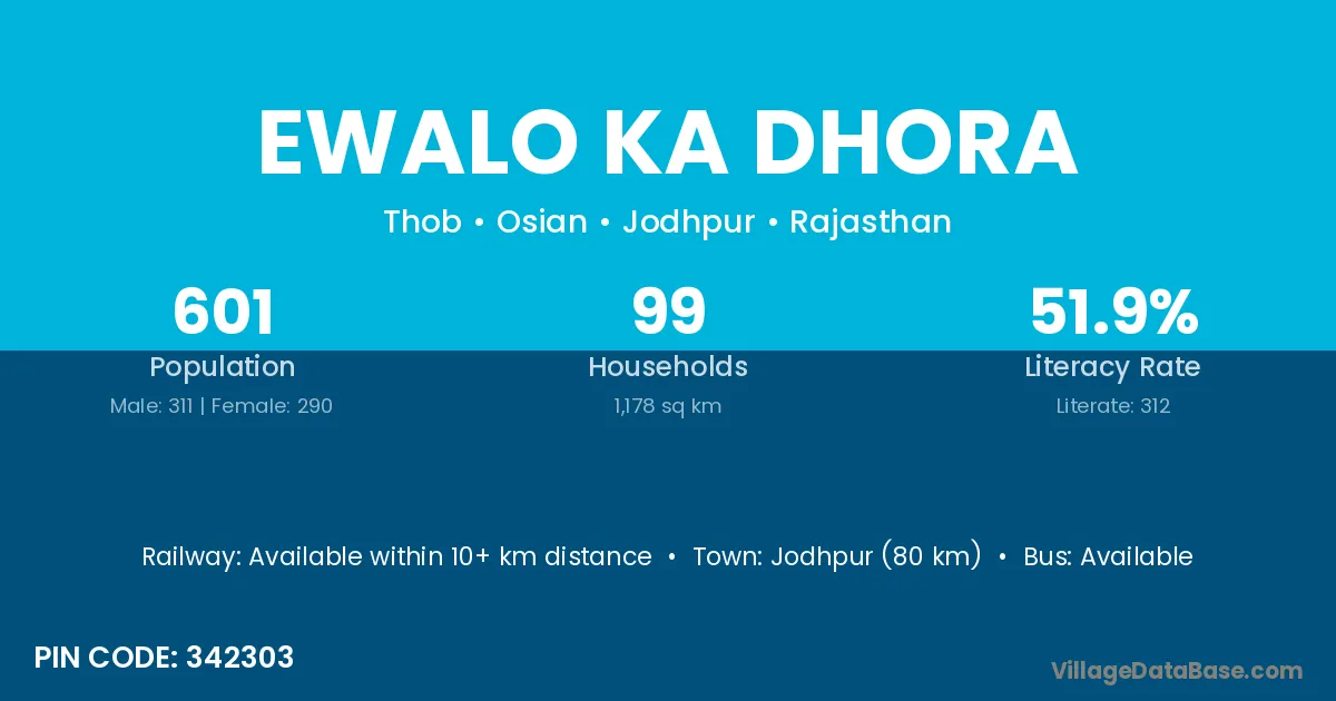 Jodhpur (80 km) is the nearest town to Ewalo Ka Dhora village for major economic activities and is located approximately 80 km away.