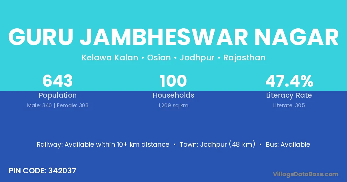 Guru Jambheswar Nagar village has a total population of 643 people, of which 340 are males and 303 are females.