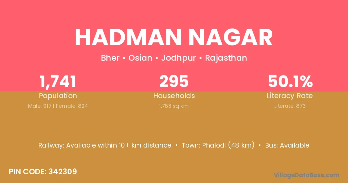 Phalodi (48 km) is the nearest town to Hadman Nagar village for major economic activities and is located approximately 48 km away.