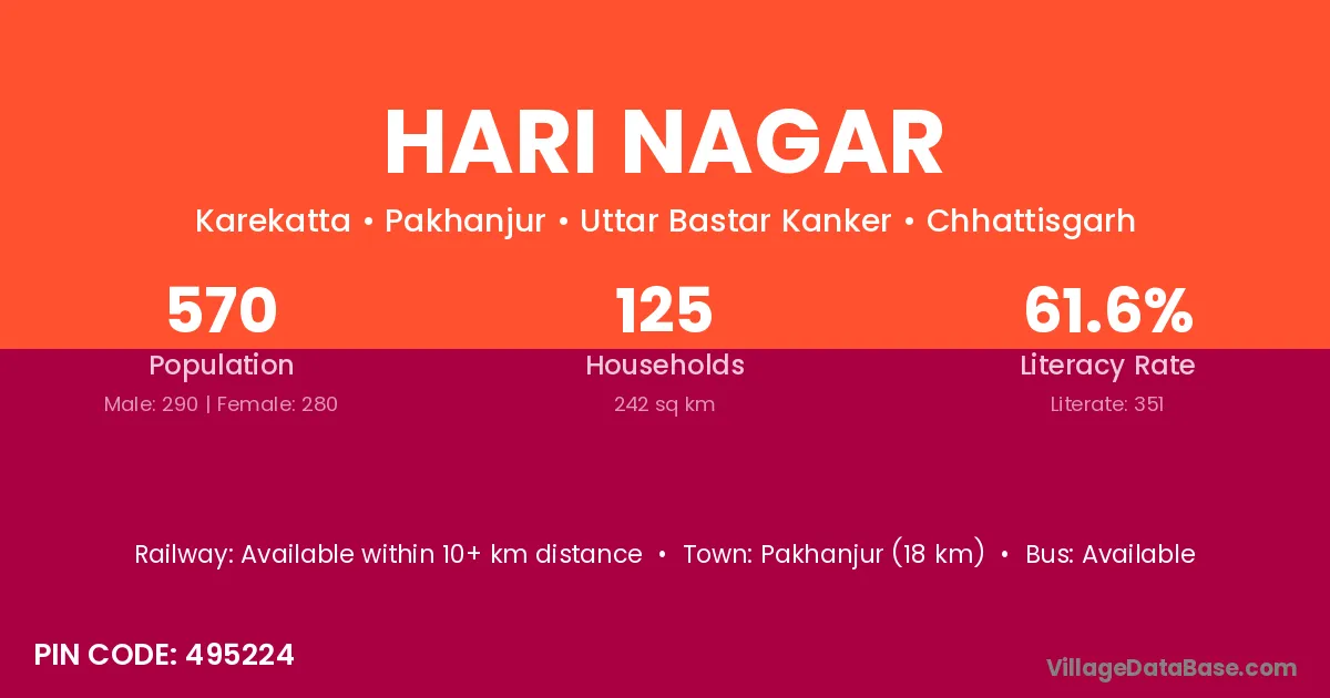The literacy rate of Hari Nagar village is 47.60%. Male literacy stands at 57.11% and female literacy at 36.68%.