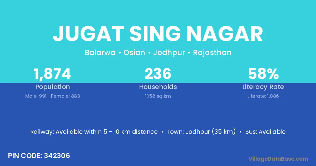 Jodhpur (35 km) is the nearest town to Jugat Sing Nagar village for major economic activities and is located approximately 35 km away.