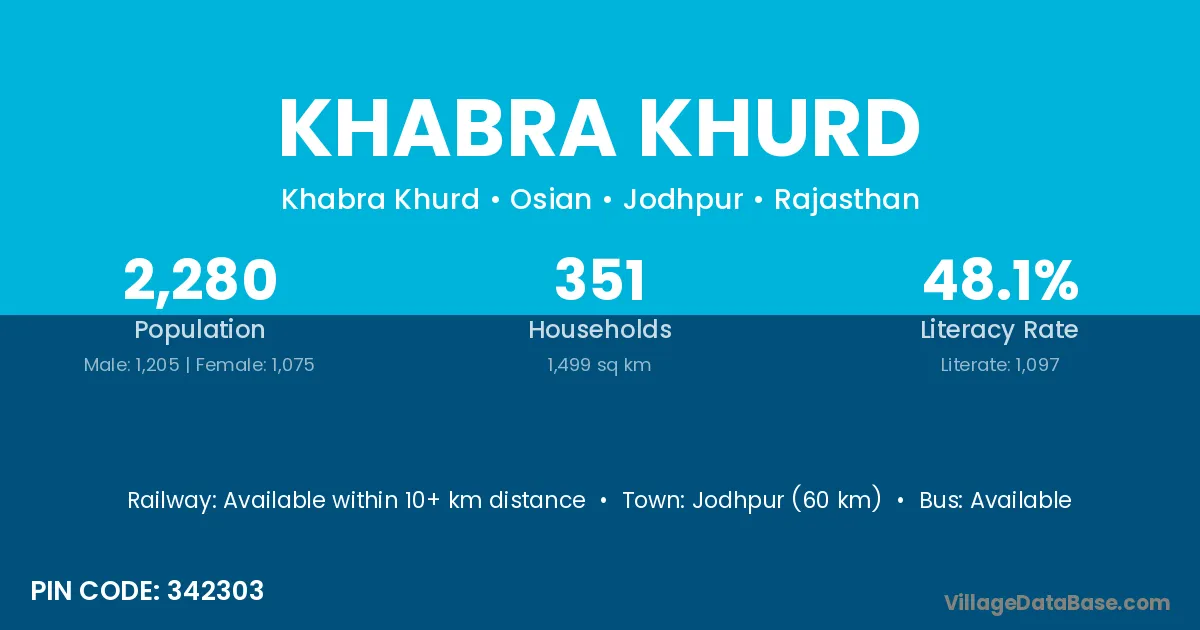 Jodhpur (60 km) is the nearest town to Khabra Khurd village for major economic activities and is located approximately 60 km away.