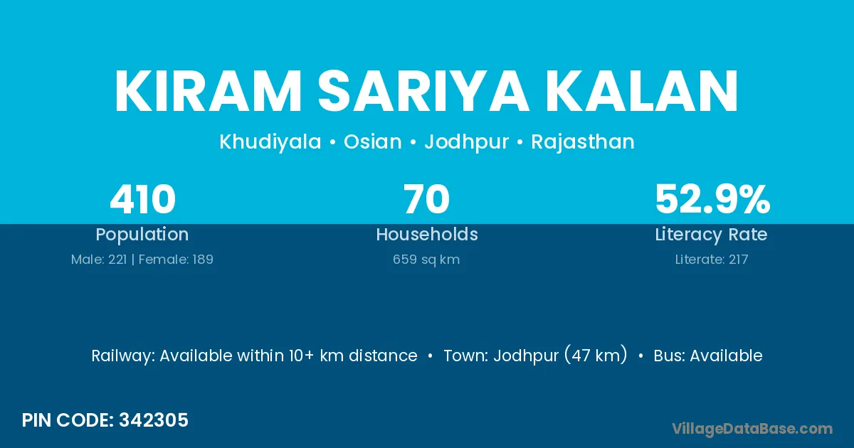 Jodhpur (47 km) is the nearest town to Kiram Sariya Kalan village for major economic activities and is located approximately 47 km away.
