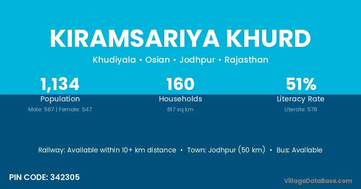 Jodhpur (50 km) is the nearest town to Kiramsariya Khurd village for major economic activities and is located approximately 50 km away.