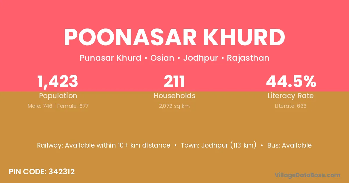 Jodhpur (113 km) is the nearest town to Poonasar Khurd village for major economic activities and is located approximately 113 km away.