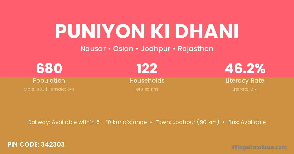 Puniyon Ki Dhani village has a total population of 680 people, of which 339 are males and 341 are females.